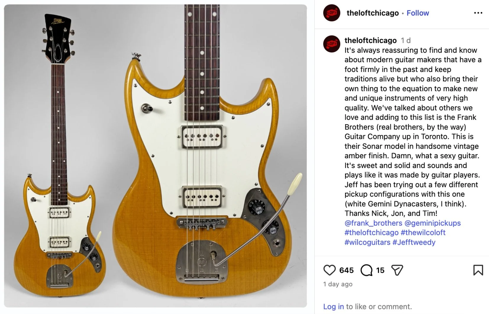 “It's always reassuring to find and know about modern guitar makers that have a foot firmly in the past and keep traditions alive but who also bring their own thing to the equation to make new and unique instruments of very high quality. We've talked about others we love and adding to this list is the Frank Brothers (real brothers, by the way) Guitar Company up in Toronto. This is their Sonar model in handsome vintage amber finish. Damn, what a sexy guitar. It's sweet and solid and sounds and plays like it was made by guitar players. Jeff has been trying out a few different pickup configurations with this one (white Gemini Dynacasters, I think). Thanks Nick, Jon, and Tim!” - The Loft, Chicago